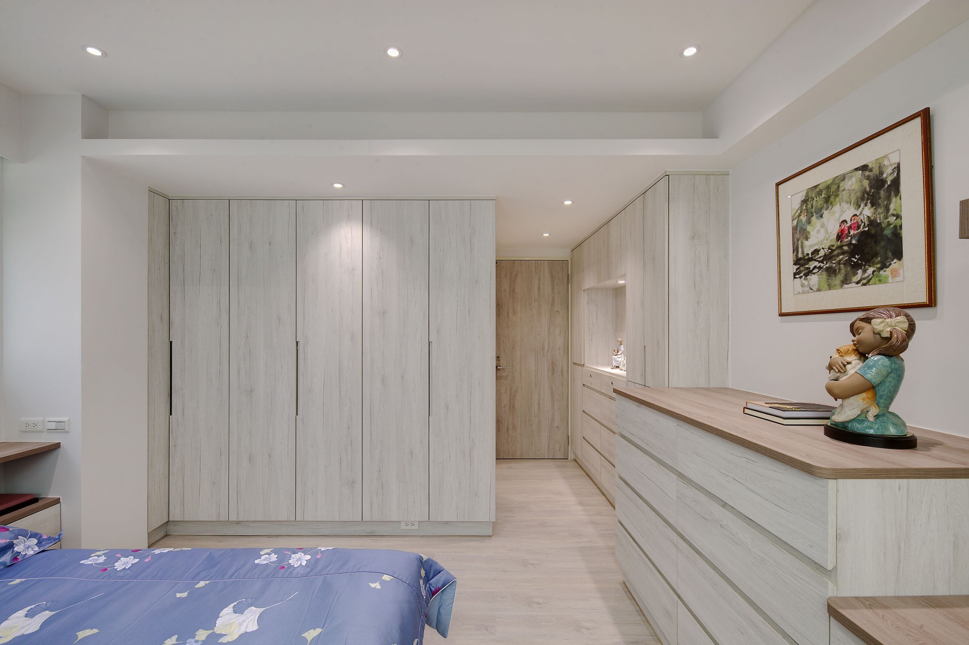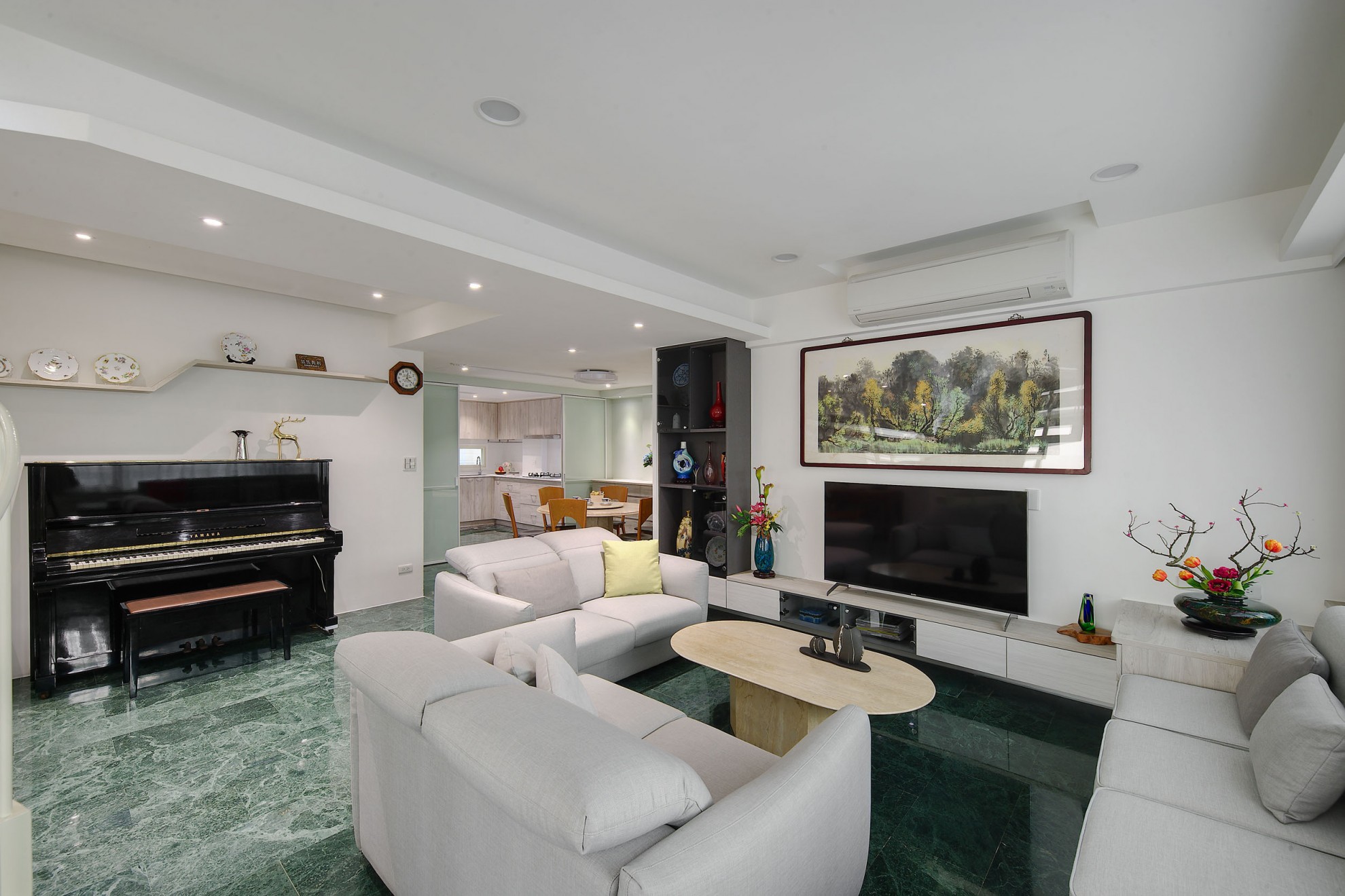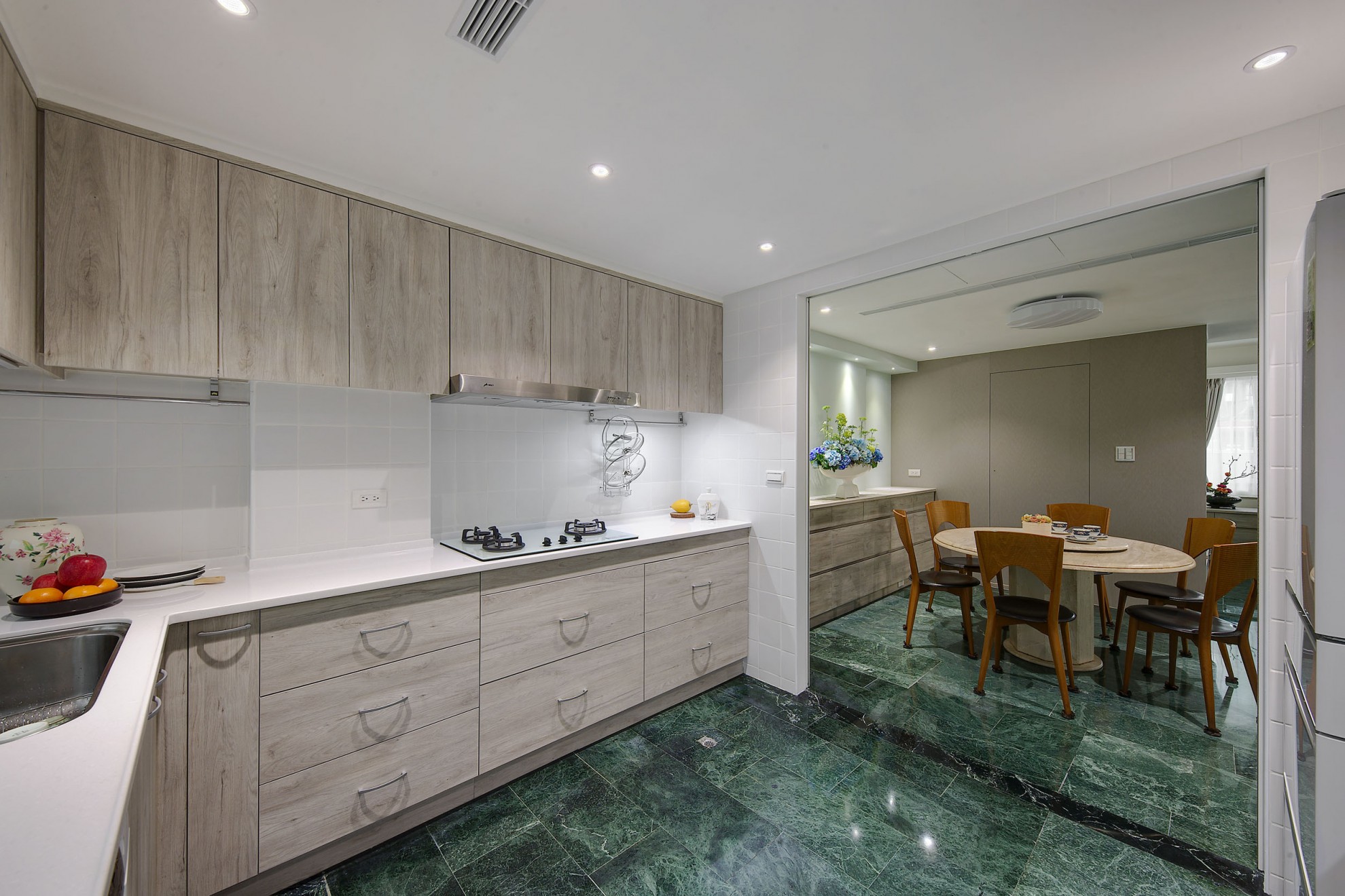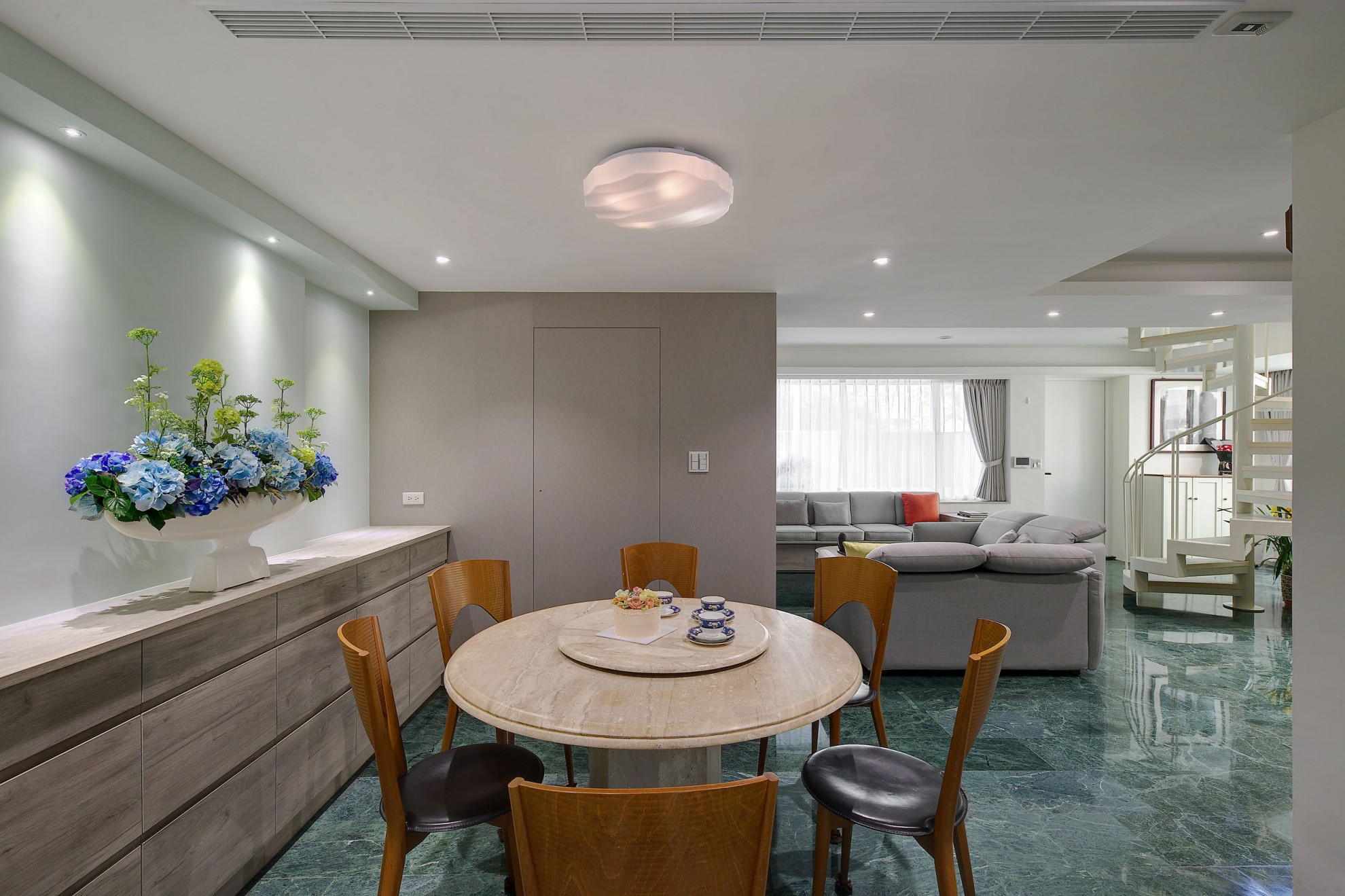 老屋翻新的與眾不同,就是在於它可以保留恆久的美麗與創造新的意境。1樓空間以入口玄關與客、餐廳、主臥與衛浴為主,透過旋梯與2樓連結。在宸舍全新的設計下,重新規劃了客、餐廳動線,擴張了許多收納櫃體卻巧妙地增加了室內空間,溫暖的灰白木紋色與翻新的原石餐桌、搭配原來稀有的深綠大理石地板、修復的旋踢踏面,誠實保留了歲月記憶,卻又給予現代感的生命力。 What makes the renovated old house unique is that it can retain its lasting beauty and create a new mood. The space on the first floor is dominated by the entrance hall and guest, dining room, master bedroom and bathroom, connected through a spiral staircase and second floor. Re-planning of the guest and restaurant lines, and many storage cabinets have subtly increased interior space. The warm gray-white wood color and the refurbished marble dining table are matched with the original dark green marble. The floor and the renovated spiral staircase appearance retain the memories of the years, but give a modern sense of vitality.