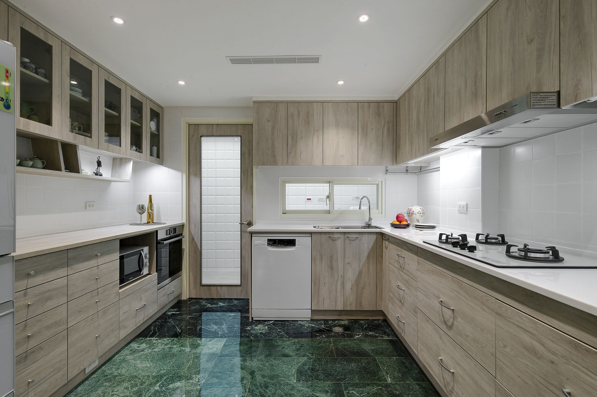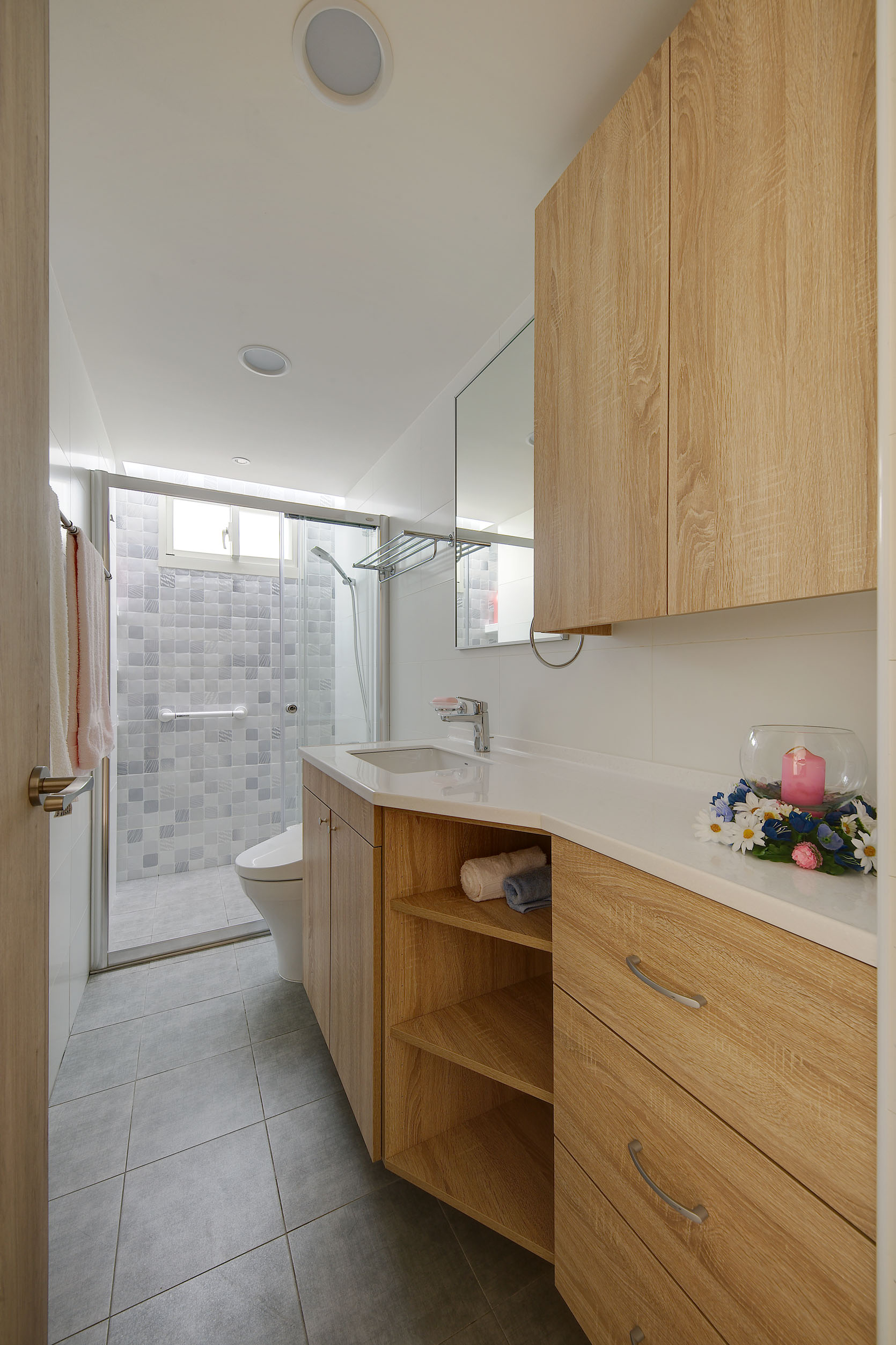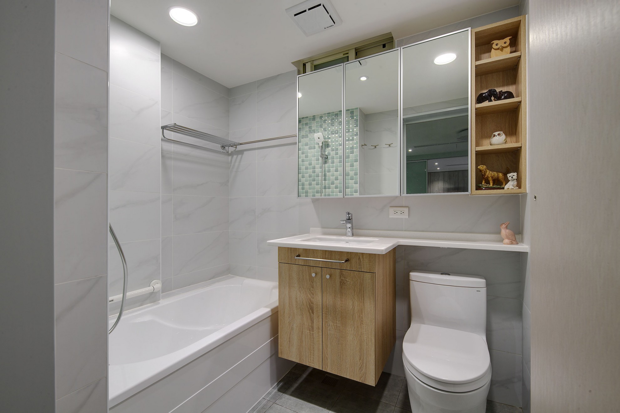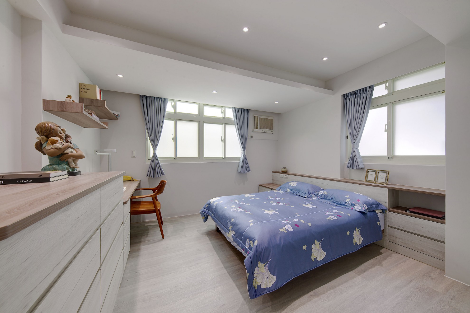 老屋翻新的與眾不同,就是在於它可以保留恆久的美麗與創造新的意境。1樓空間以入口玄關與客、餐廳、主臥與衛浴為主,透過旋梯與2樓連結。在宸舍全新的設計下,重新規劃了客、餐廳動線,擴張了許多收納櫃體卻巧妙地增加了室內空間,溫暖的灰白木紋色與翻新的原石餐桌、搭配原來稀有的深綠大理石地板、修復的旋踢踏面,誠實保留了歲月記憶,卻又給予現代感的生命力。 What makes the renovated old house unique is that it can retain its lasting beauty and create a new mood. The space on the first floor is dominated by the entrance hall and guest, dining room, master bedroom and bathroom, connected through a spiral staircase and second floor. Re-planning of the guest and restaurant lines, and many storage cabinets have subtly increased interior space. The warm gray-white wood color and the refurbished marble dining table are matched with the original dark green marble. The floor and the renovated spiral staircase appearance retain the memories of the years, but give a modern sense of vitality.