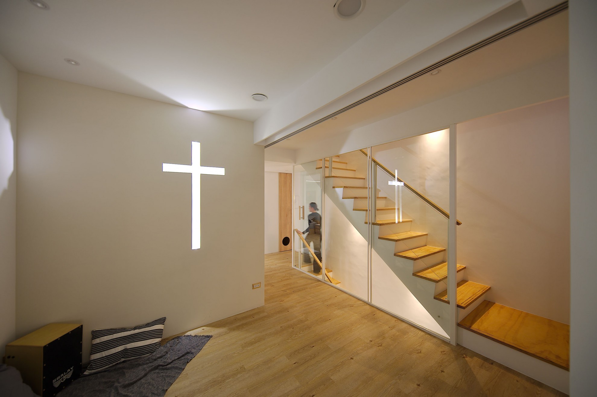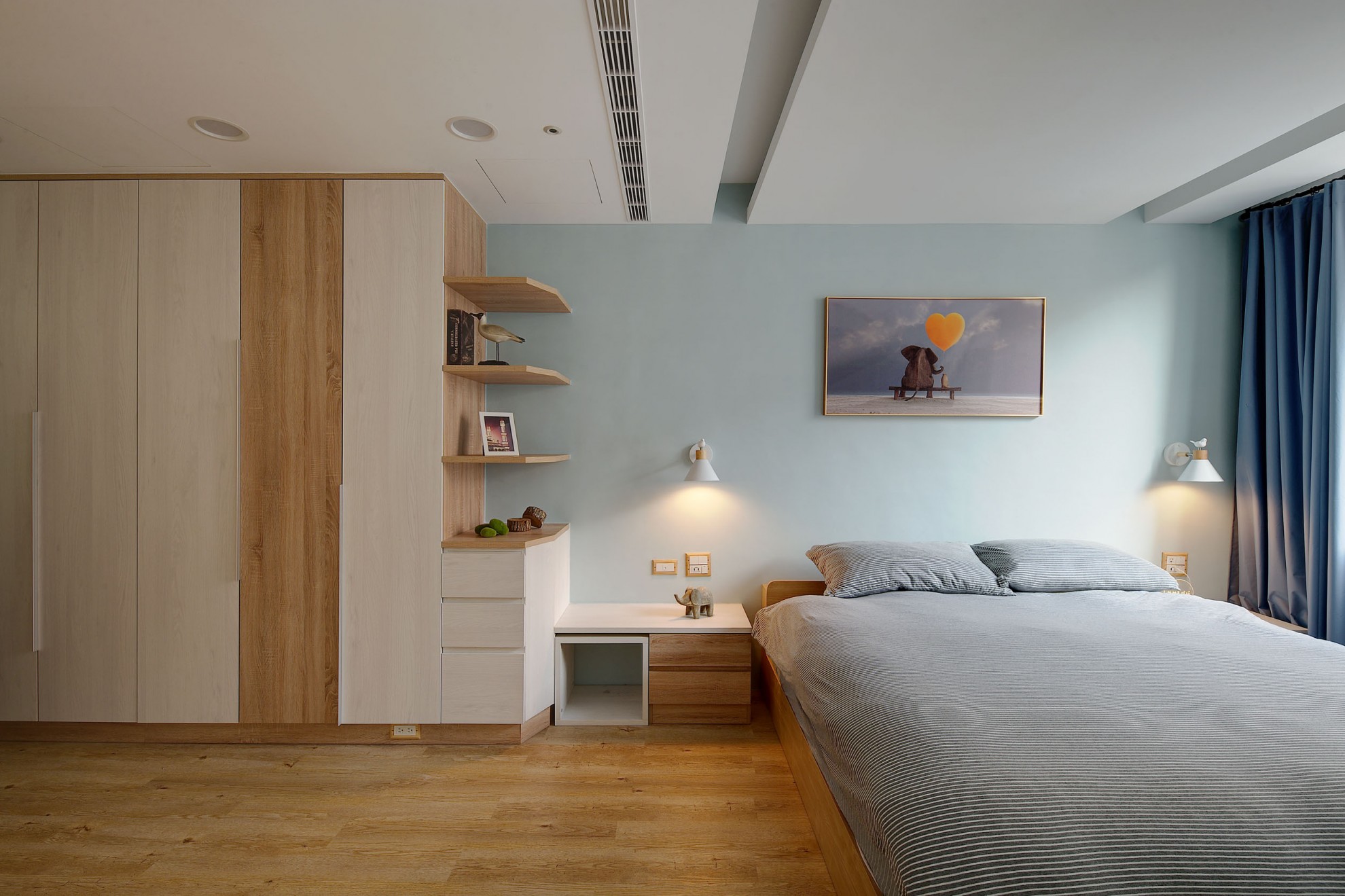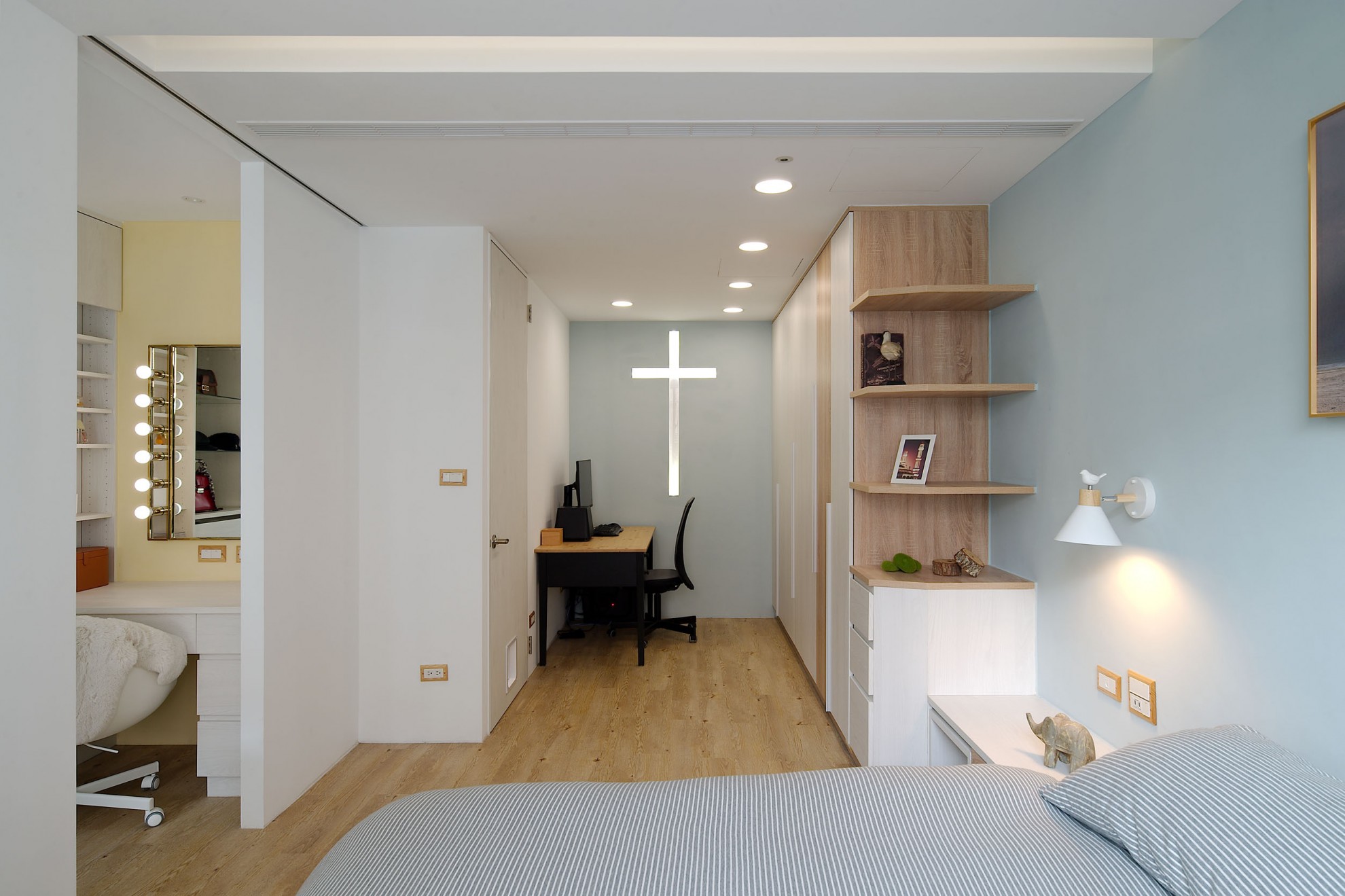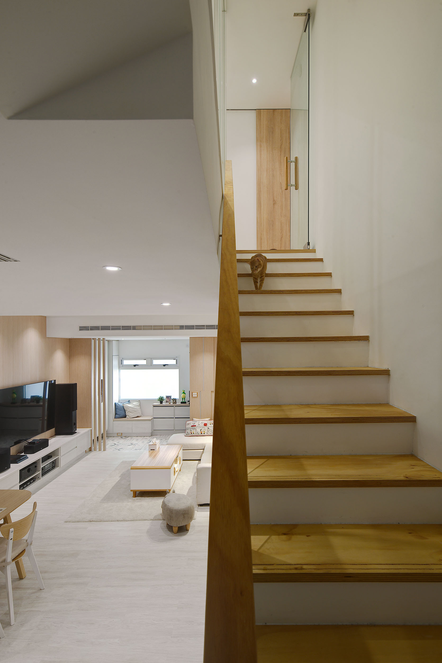 The blue vitality, the shadow of the entrance and the tiles make people relax. The TV wall in the living room and cabinet extend to the dining table and bar not only increases the seats but enlarge the space. Some cabinets are designed for cats to rest. Walk along the wooden stairs to the master bedroom on the second floor. The dark blue curtains, light blue walls, crucifix walls, wood-grain floors, and wardrobes satisfy the meaning and faith of the faint. So far, the old house has re-presented the connection between space, people, pets and belief, which also made life and soul full of vitality and radiance.