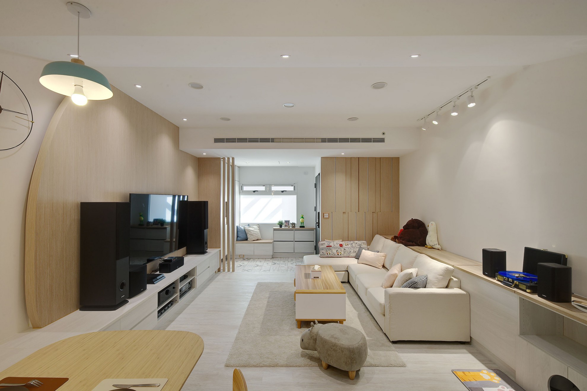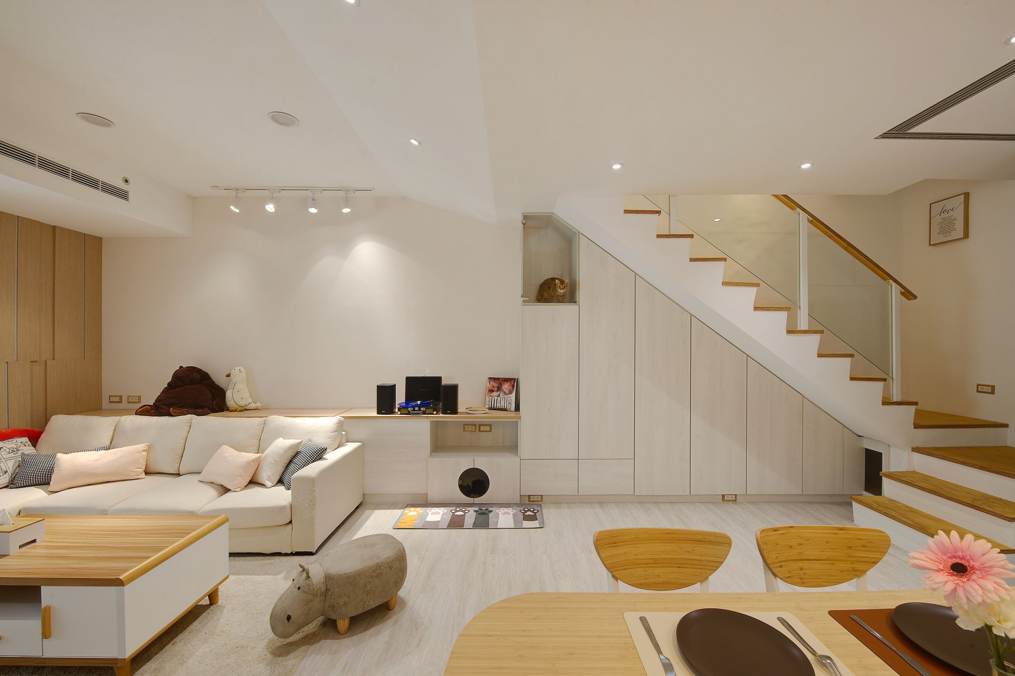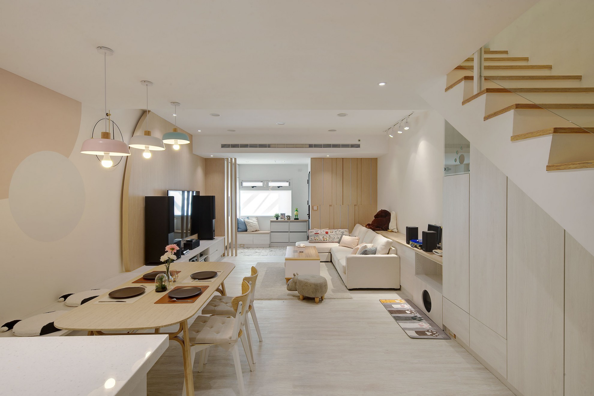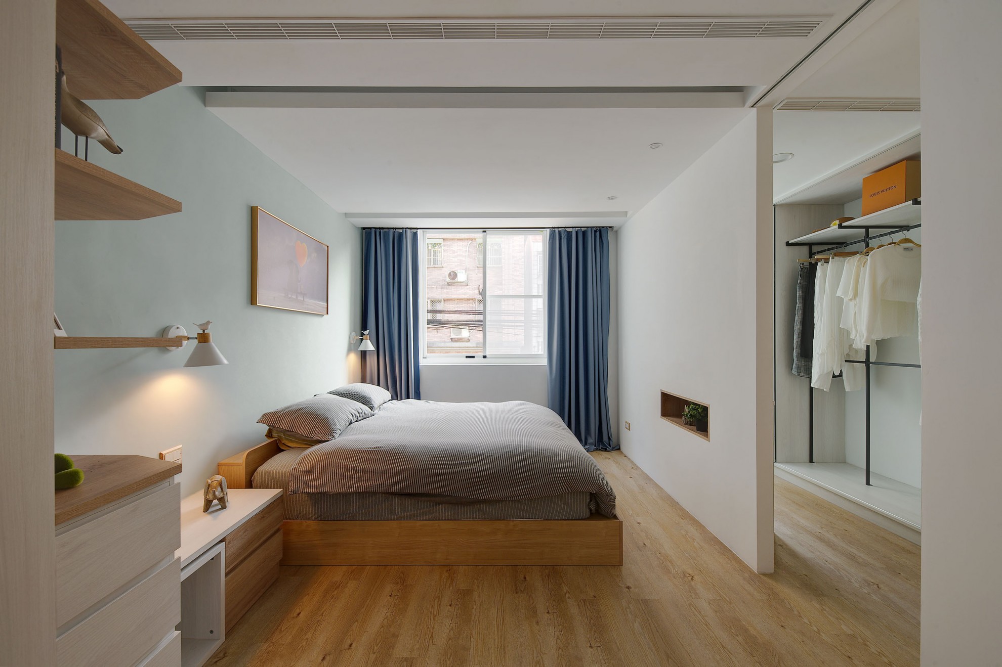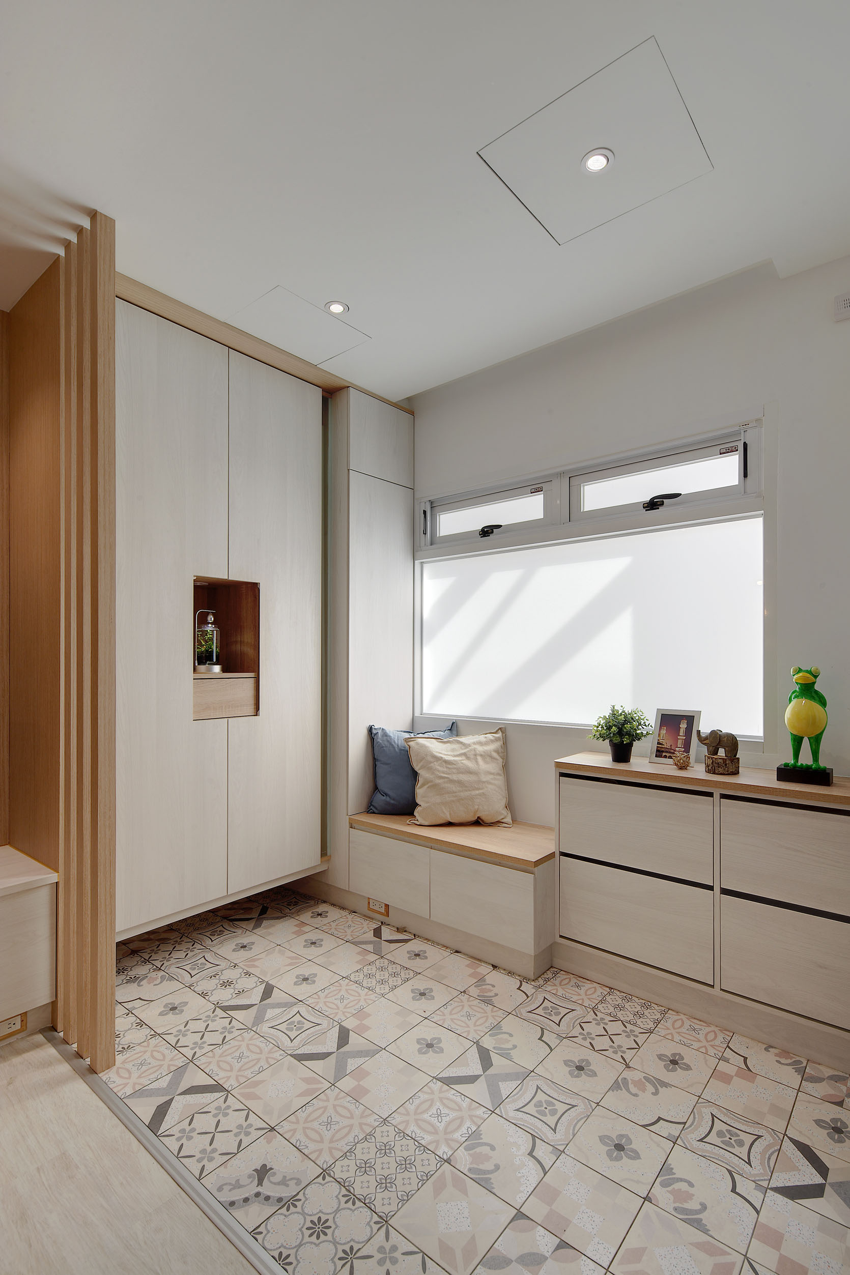 The blue vitality, the shadow of the entrance and the tiles make people relax. The TV wall in the living room and cabinet extend to the dining table and bar not only increases the seats but enlarge the space. Some cabinets are designed for cats to rest. Walk along the wooden stairs to the master bedroom on the second floor. The dark blue curtains, light blue walls, crucifix walls, wood-grain floors, and wardrobes satisfy the meaning and faith of the faint. So far, the old house has re-presented the connection between space, people, pets and belief, which also made life and soul full of vitality and radiance.