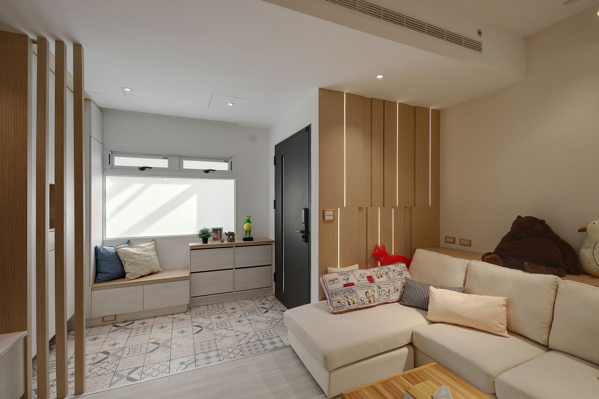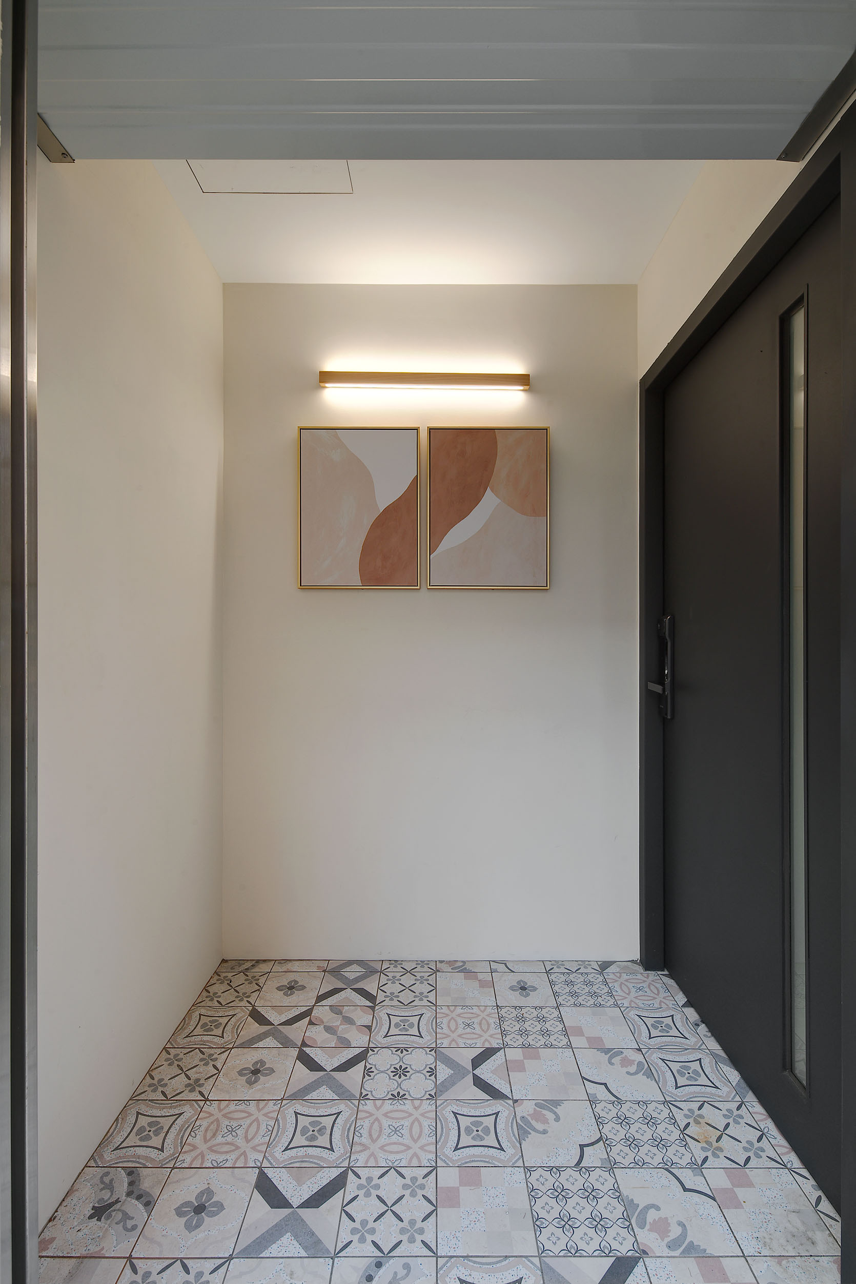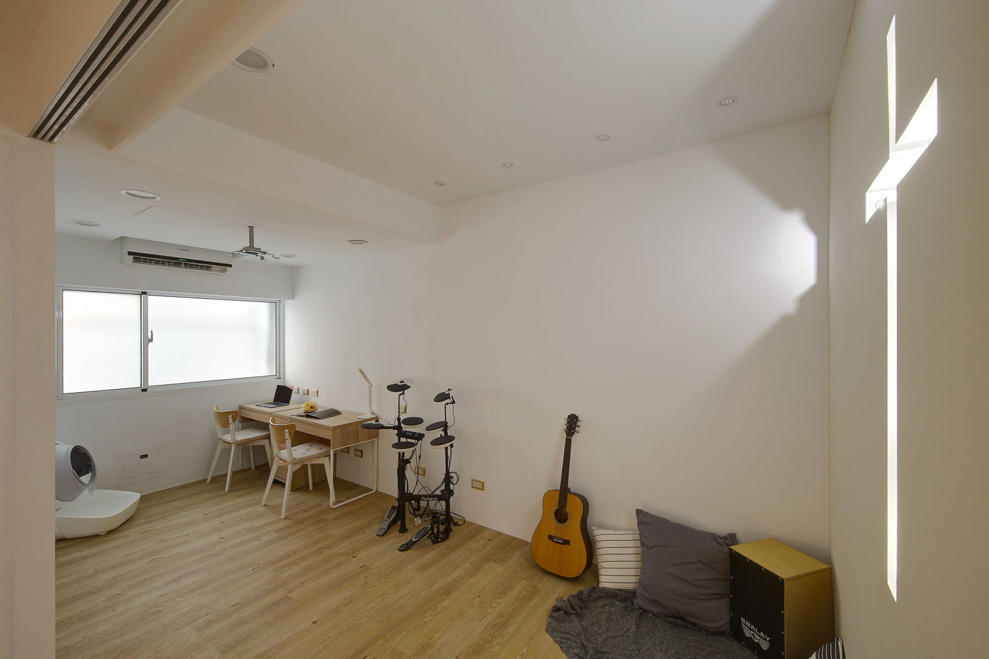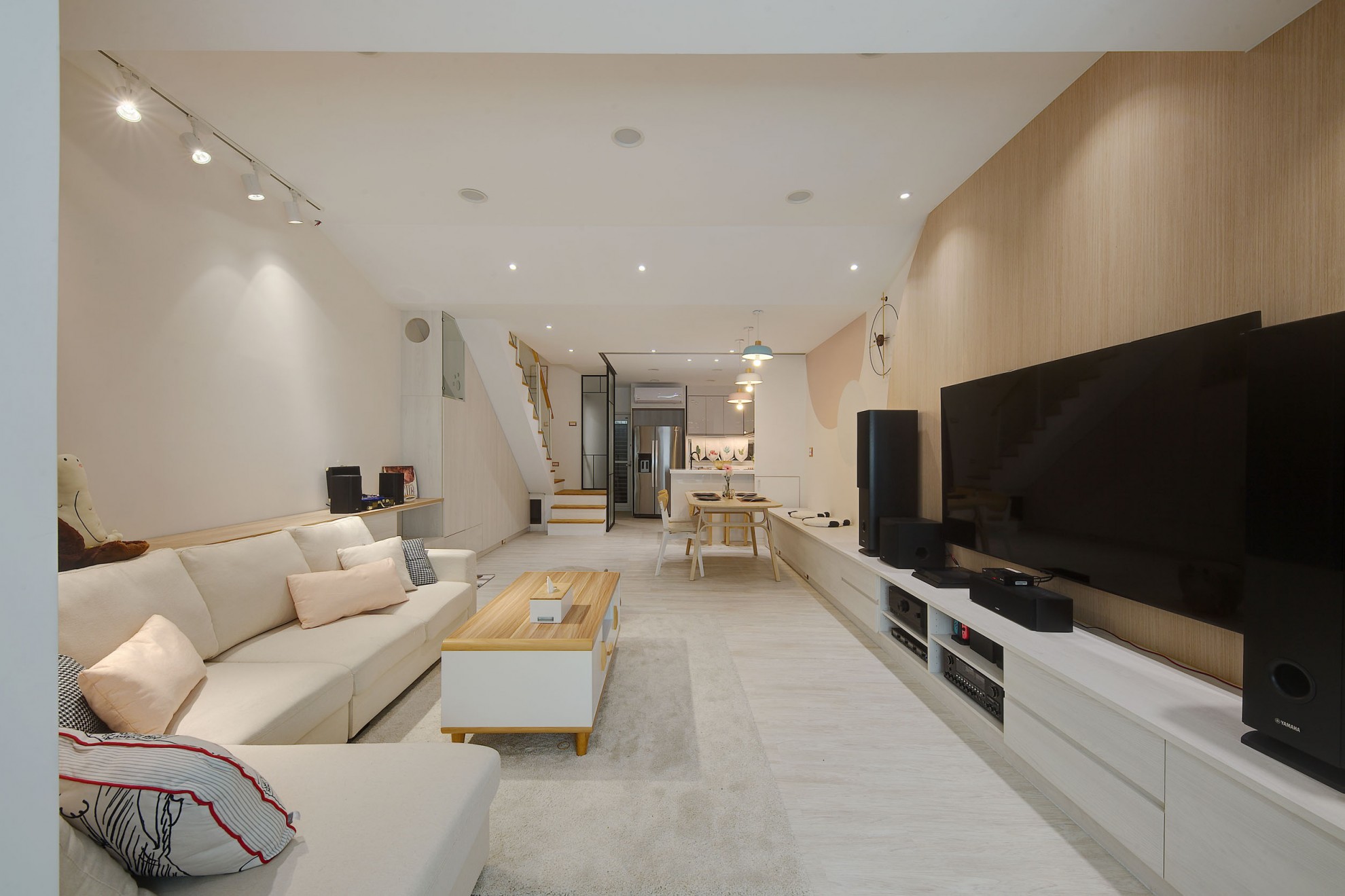 The blue vitality, the shadow of the entrance and the tiles make people relax. The TV wall in the living room and cabinet extend to the dining table and bar not only increases the seats but enlarge the space. Some cabinets are designed for cats to rest. Walk along the wooden stairs to the master bedroom on the second floor. The dark blue curtains, light blue walls, crucifix walls, wood-grain floors, and wardrobes satisfy the meaning and faith of the faint. So far, the old house has re-presented the connection between space, people, pets and belief, which also made life and soul full of vitality and radiance.