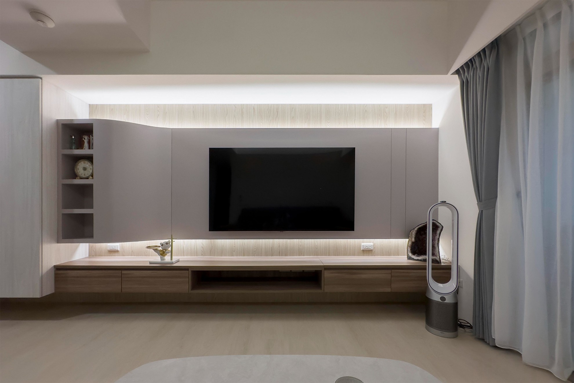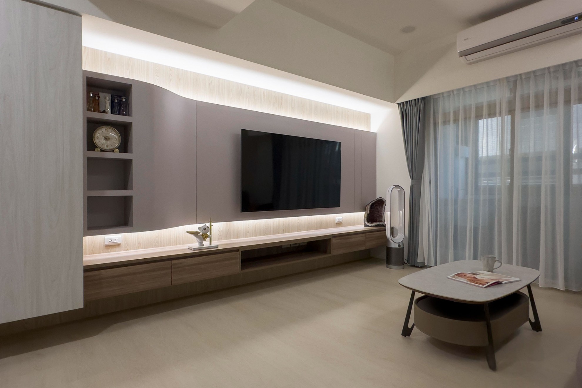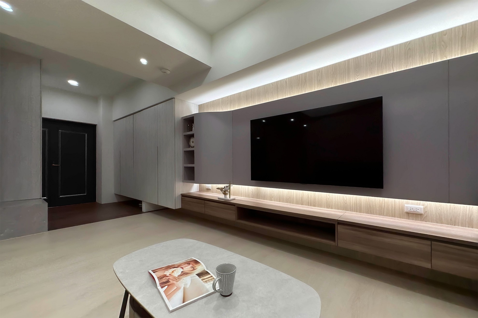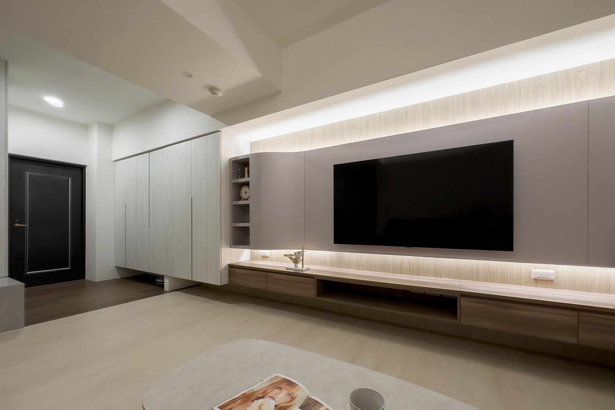 大門玄關進入落塵區,鞋櫃的肚量設計滿足家庭的需求;接著是寬敞的大客廳,坐上沙發瞬間放鬆又舒適,曲面造型設計的電視牆與間接光則迷幻紓解了一天的疲勞。