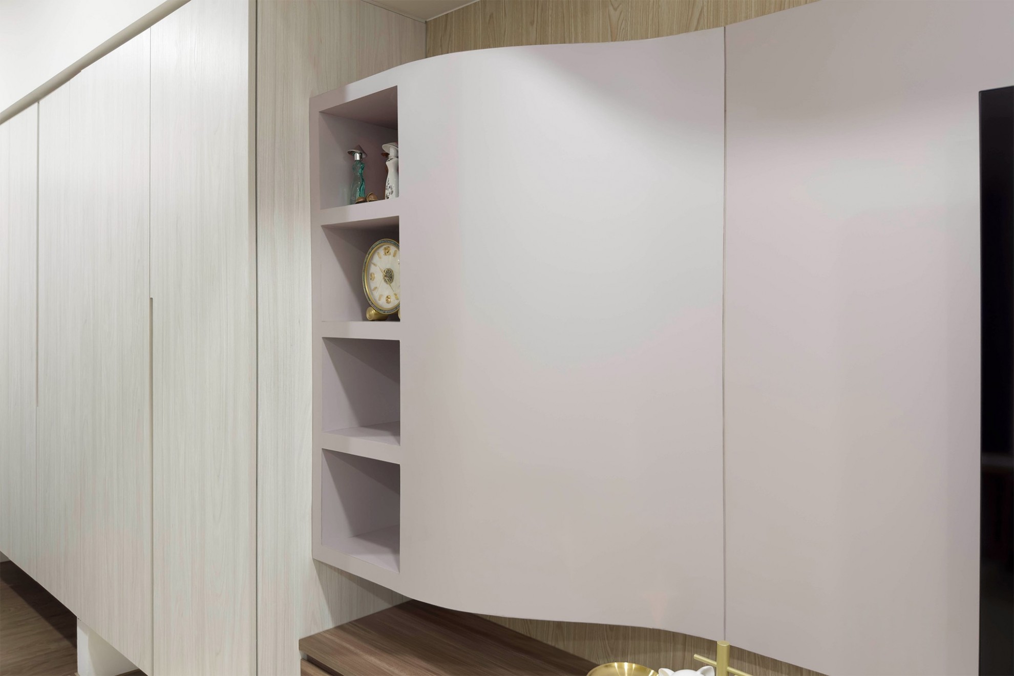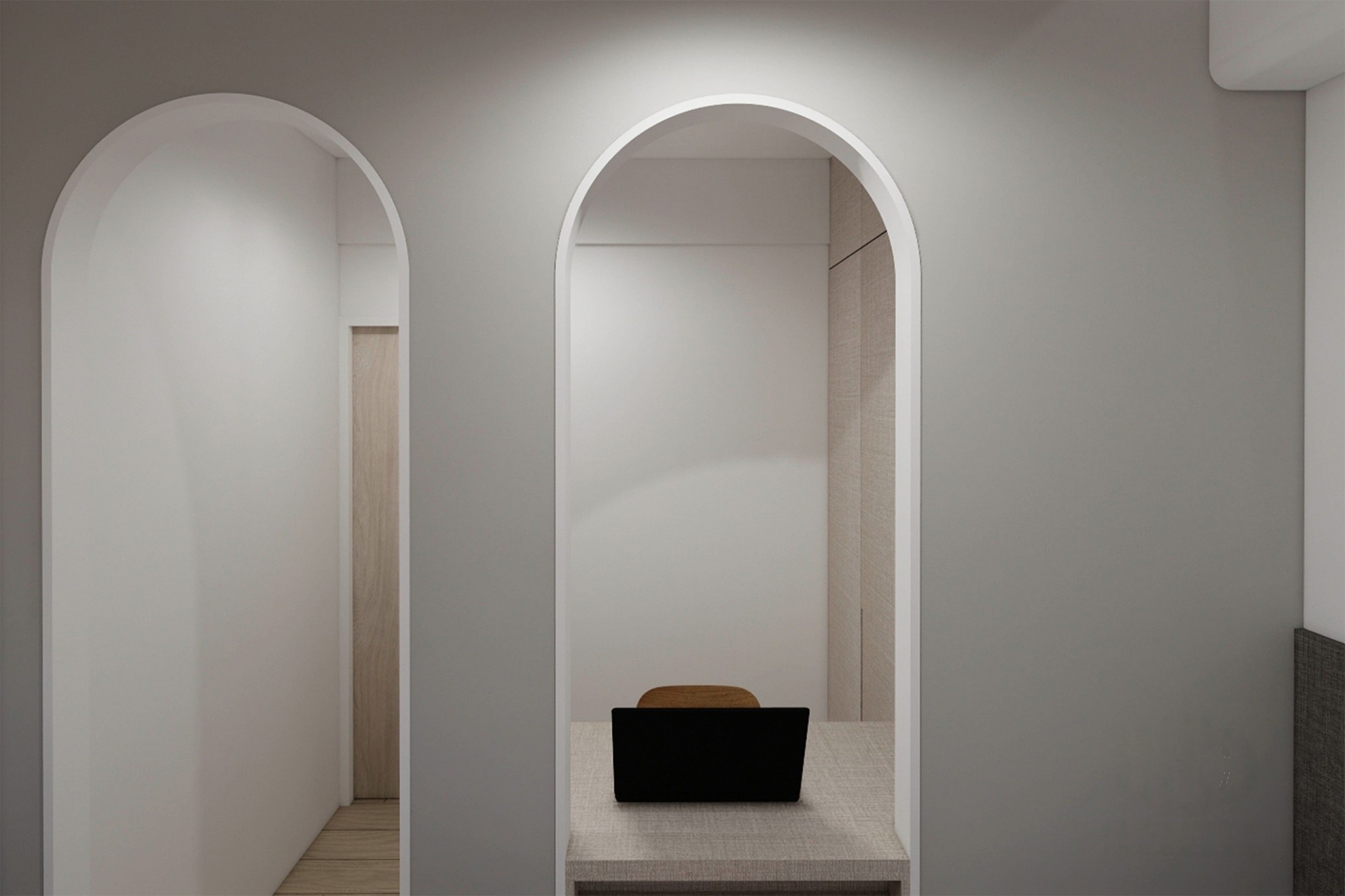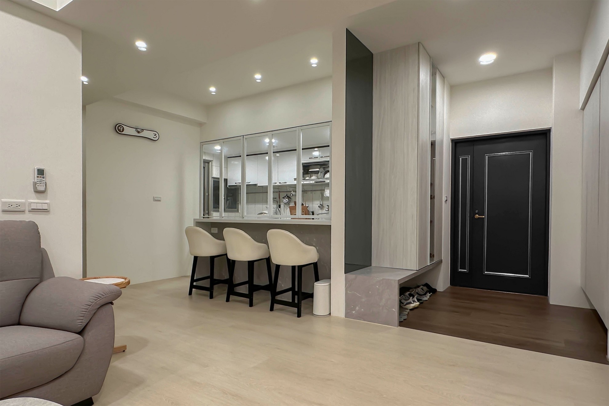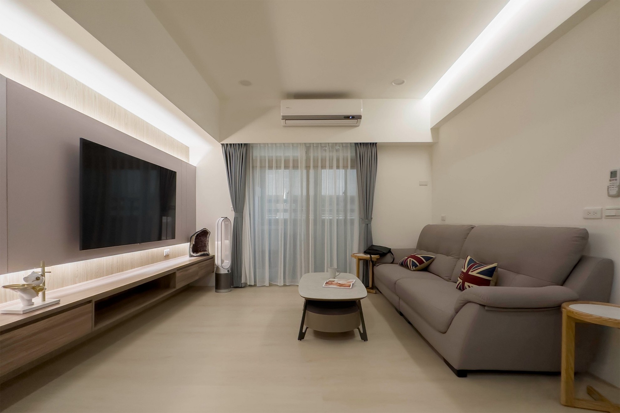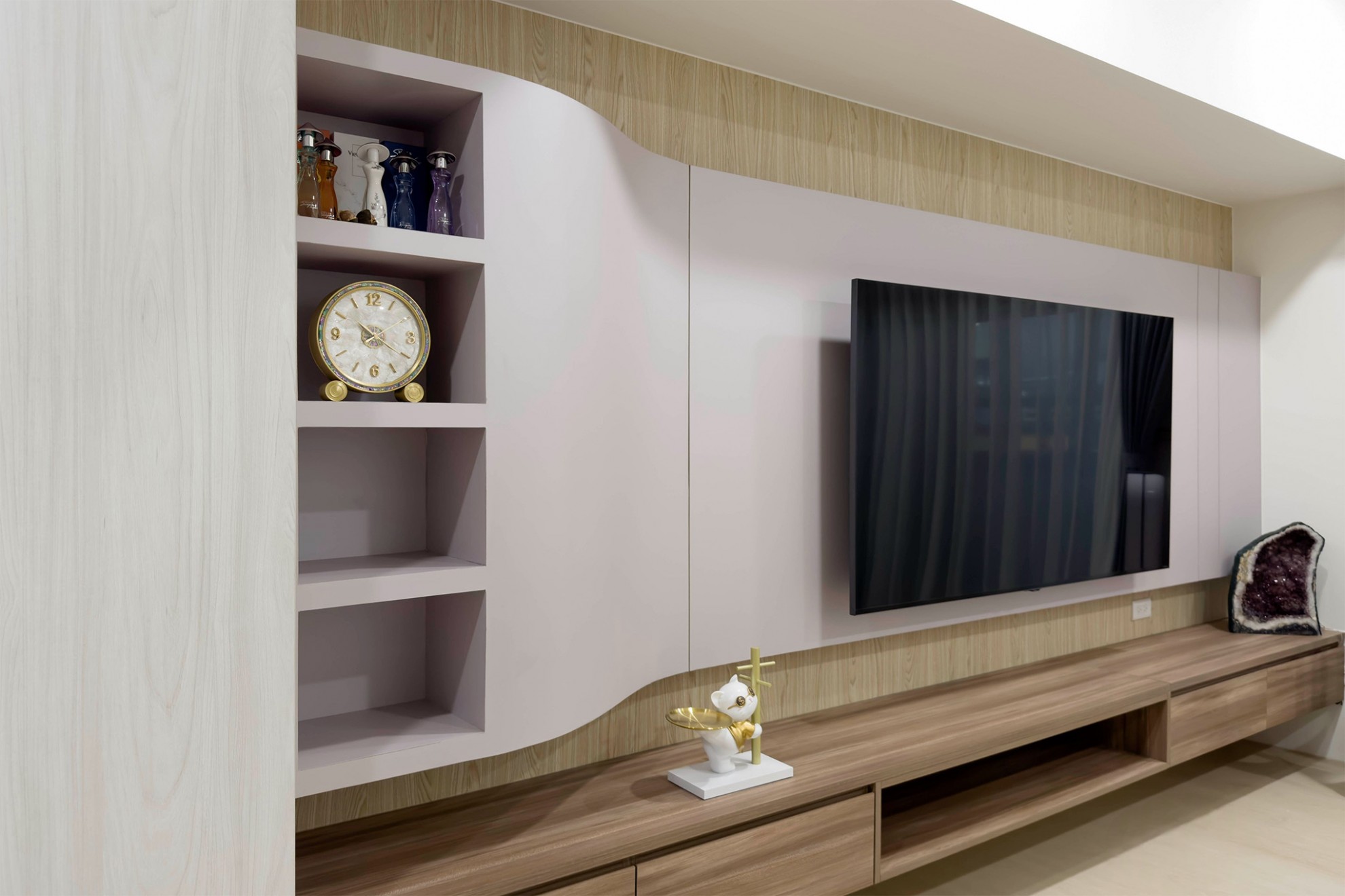 大門玄關進入落塵區,鞋櫃的肚量設計滿足家庭的需求;接著是寬敞的大客廳,坐上沙發瞬間放鬆又舒適,曲面造型設計的電視牆與間接光則迷幻紓解了一天的疲勞。