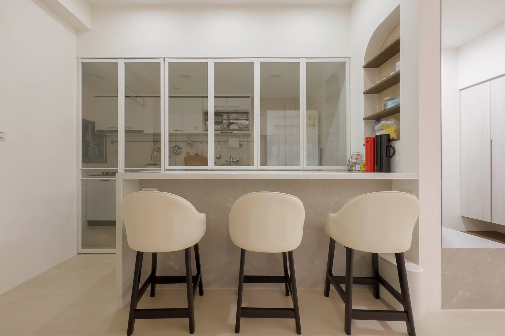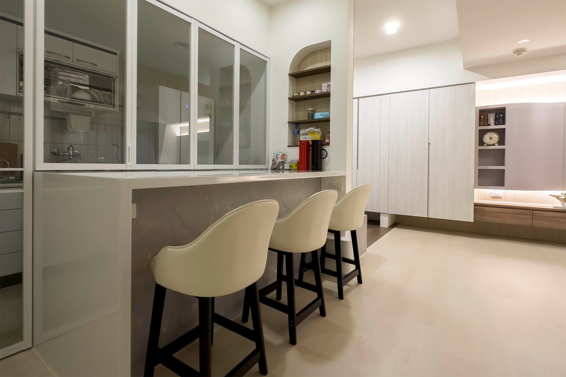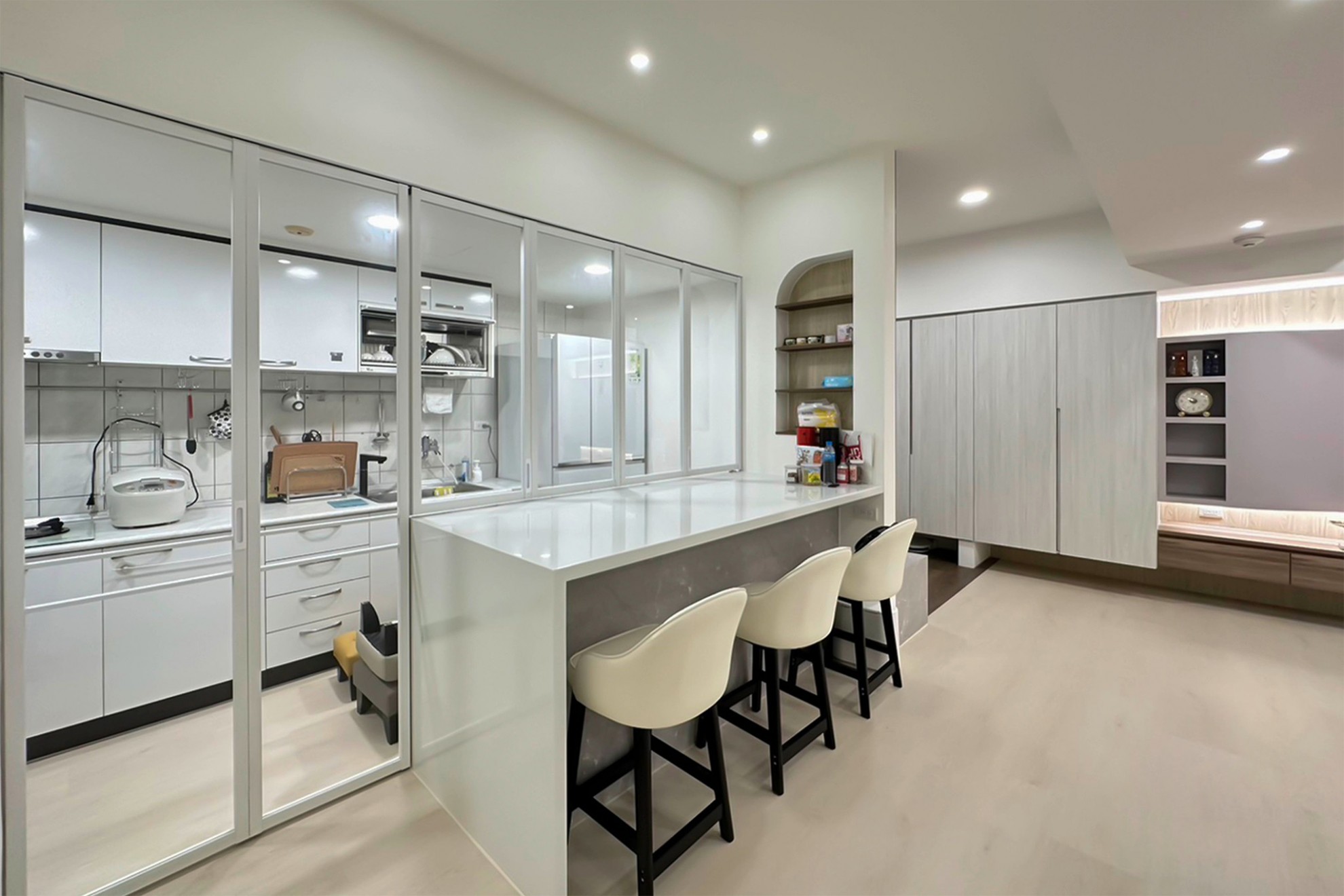 目光左去是吧檯也是用餐區,半開放的廚房不僅採光好又能避油煙,能一邊烹調一邊與家人談話,增進了家庭成員之間的互動。