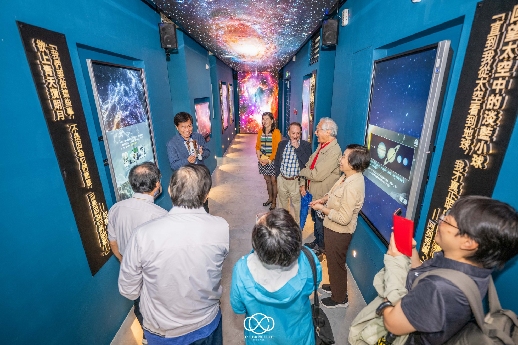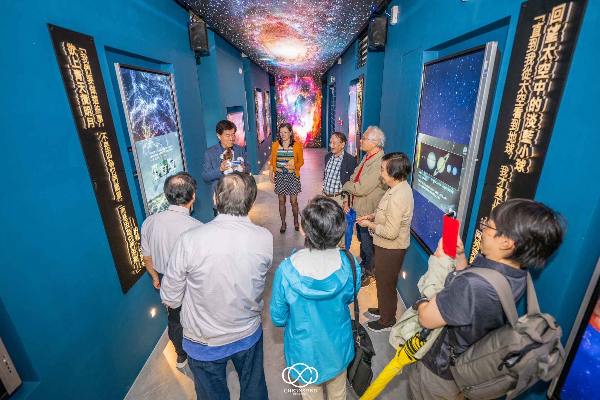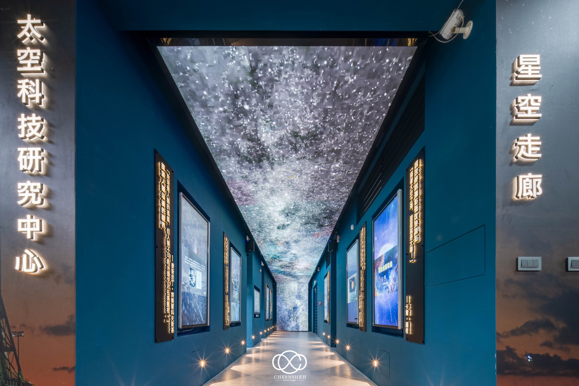 為了呈現浩瀚無限的宇宙,以沉浸式光影技術打造的視覺饗宴!超過10公尺的LED天幕呈現璀璨銀河在頭頂上方自然流動,讓同學們穿越走廊就彷彿步入宇宙之中。